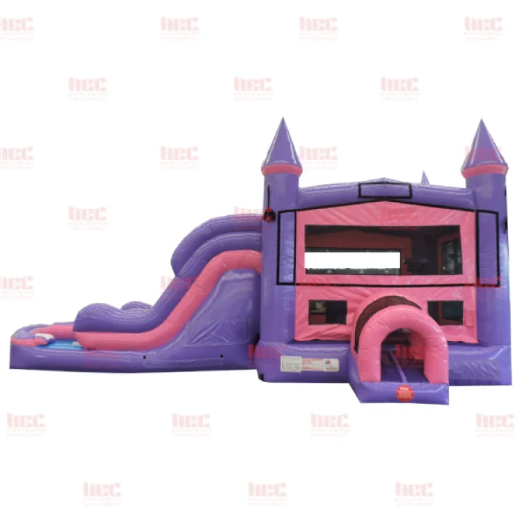 Our Pink and Purple Dual Lane Combo Bounce and Slide! The pink and purple colors make this party rental inflatable pop for any event or birthday party. This inflatable combo bounce and slide has a bounce area, pop up obstacle, climb area, slide and basketball hoop for those high flying kids that make a birthday party special. This combo bouncer is 32’L x 16’W x 16’H