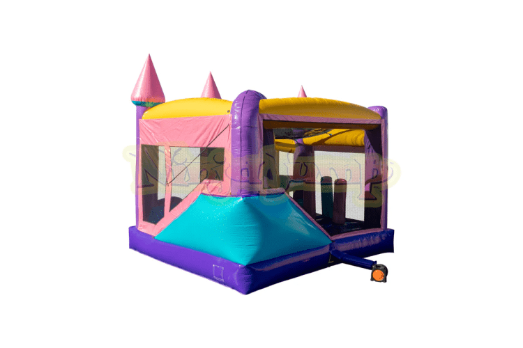 Our newest inflatable combo bouncer is this dazzling 5n1 combo. Combo bounce house rentals are the perfect combination of a bounce house and slide all in one piece! The pink sparkling vinyl and colors of pink, purple and baby blue make this party rental inflatable pop for any event or birthday party. This inflatable combo bounce and slide has a bounce area, climb area, slide and basketball hoop for those high flying kids that make a birthday party special. This combination moonwalk also accepts any of our art panels (please call our office for a list of all themes we offer). We provide clean, on-time bounce house rentals for our customers. Looking for the best in inflatable rentals? Let us help make your next event the BEST EVENT EVER! Pair your combo bounce house rental with one of our inflatable games!