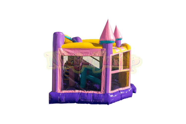 Our newest inflatable combo bouncer is this dazzling 5n1 combo. Combo bounce house rentals are the perfect combination of a bounce house and slide all in one piece! The pink sparkling vinyl and colors of pink, purple and baby blue make this party rental inflatable pop for any event or birthday party. This inflatable combo bounce and slide has a bounce area, climb area, slide and basketball hoop for those high flying kids that make a birthday party special. This combination moonwalk also accepts any of our art panels (please call our office for a list of all themes we offer). We provide clean, on-time bounce house rentals for our customers. Looking for the best in inflatable rentals? Let us help make your next event the BEST EVENT EVER! Pair your combo bounce house rental with one of our inflatable games!